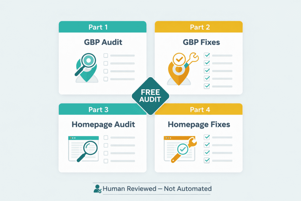 What exactly is included in the audit? Four things: GBP audit, recommended GBP fixes, homepage audit, and recommended homepage fixes. All specific, actionable, and written in plain English.